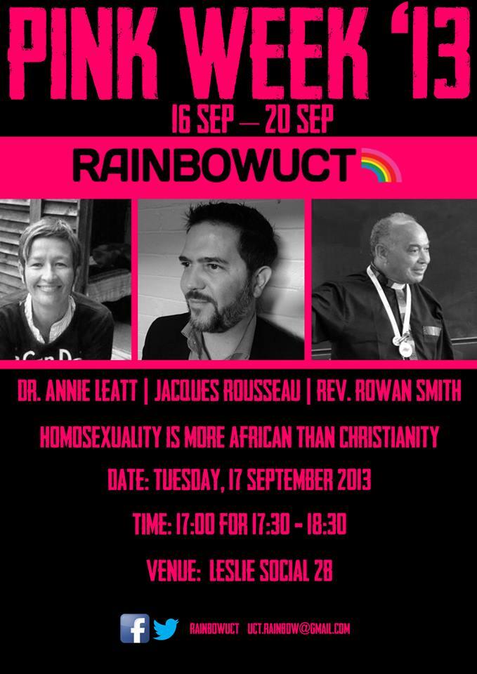Later today, I’ll be taking part in a panel discussion on the topic “Homosexuality is more African than Christianity”, as part of UCT’s Pink Week. Seeing as no less an authority than Errol Naidoo has previously described me as a “homosexual activist“, I guess I’m qualified, and the topic should make for a fun discussion.